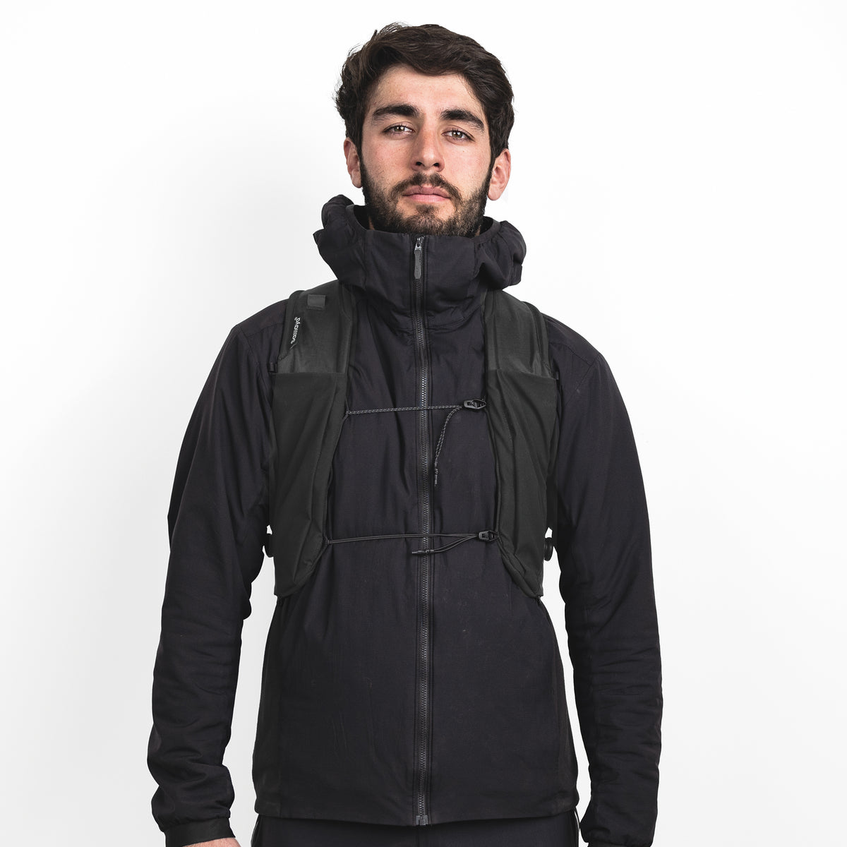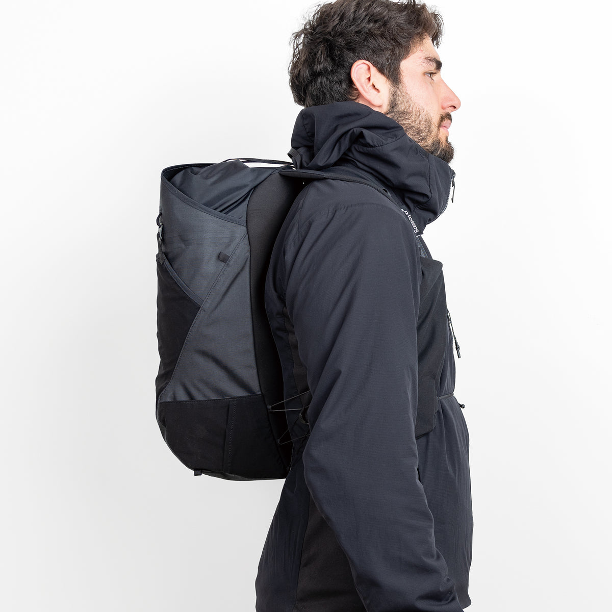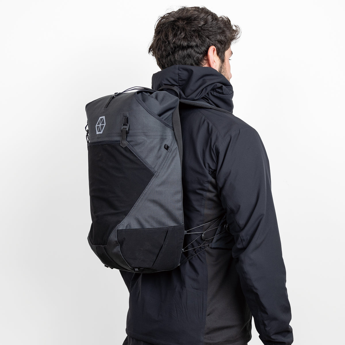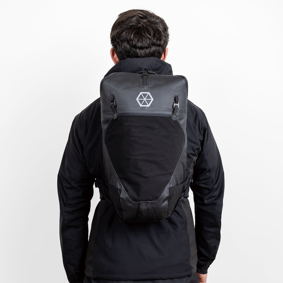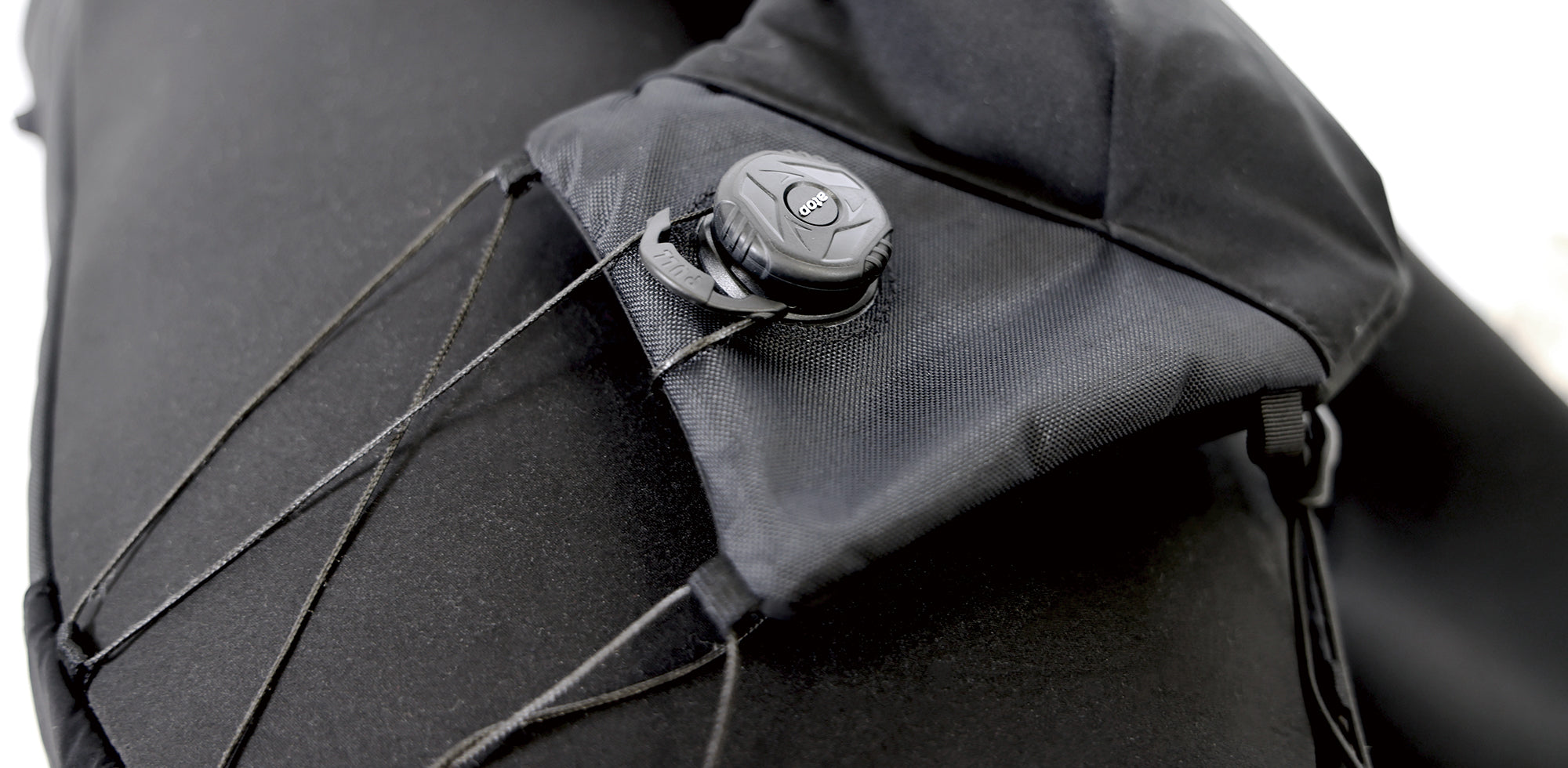 耐水圧30,000mmと高防水性のリサイクルナイロン生地を本体に採用し、ショルダーハーネスのフィッティングはダイヤル式の”atop”を採用。チェストストラップは上下2か所止め。下側はストレッチコード仕様。本体トップはコードで締めたうえにフラップを被せます。フラップ固定のテープは、ロープや脱いだウェアの仮止めにも使えます。