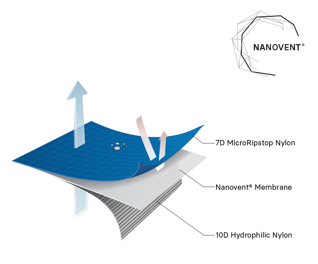 Samayaが開発したNanovent®は外側は疎水性ナイロンと内側は親水性ナイロンにメンブレンをラミネートした3層構造次世代ファブリックです。