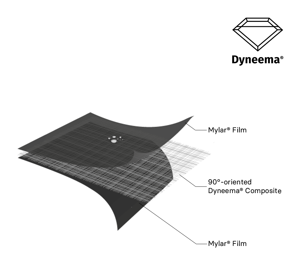 通常のポリエチレンより極端に分子量を増した超高分子量ポリエチレン(UHMWPE)とMylar®を貼り合わせた構造。UHMWPEは、非常に軽量でありながら突出した耐衝撃性を実現し、耐摩耗性にも優れる。Mylar®を貼り合わせることで、高い摩耗性と防水性を合わせ持つ組み合わせとなる。