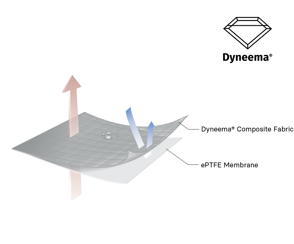 ePTFE素材をラミネートすることにより40,000g/m²/24hの透湿性と20,000mmの耐水圧を実現しています。また、Dyneema®自体の吸水・保水率が非常に低いことも特徴です。