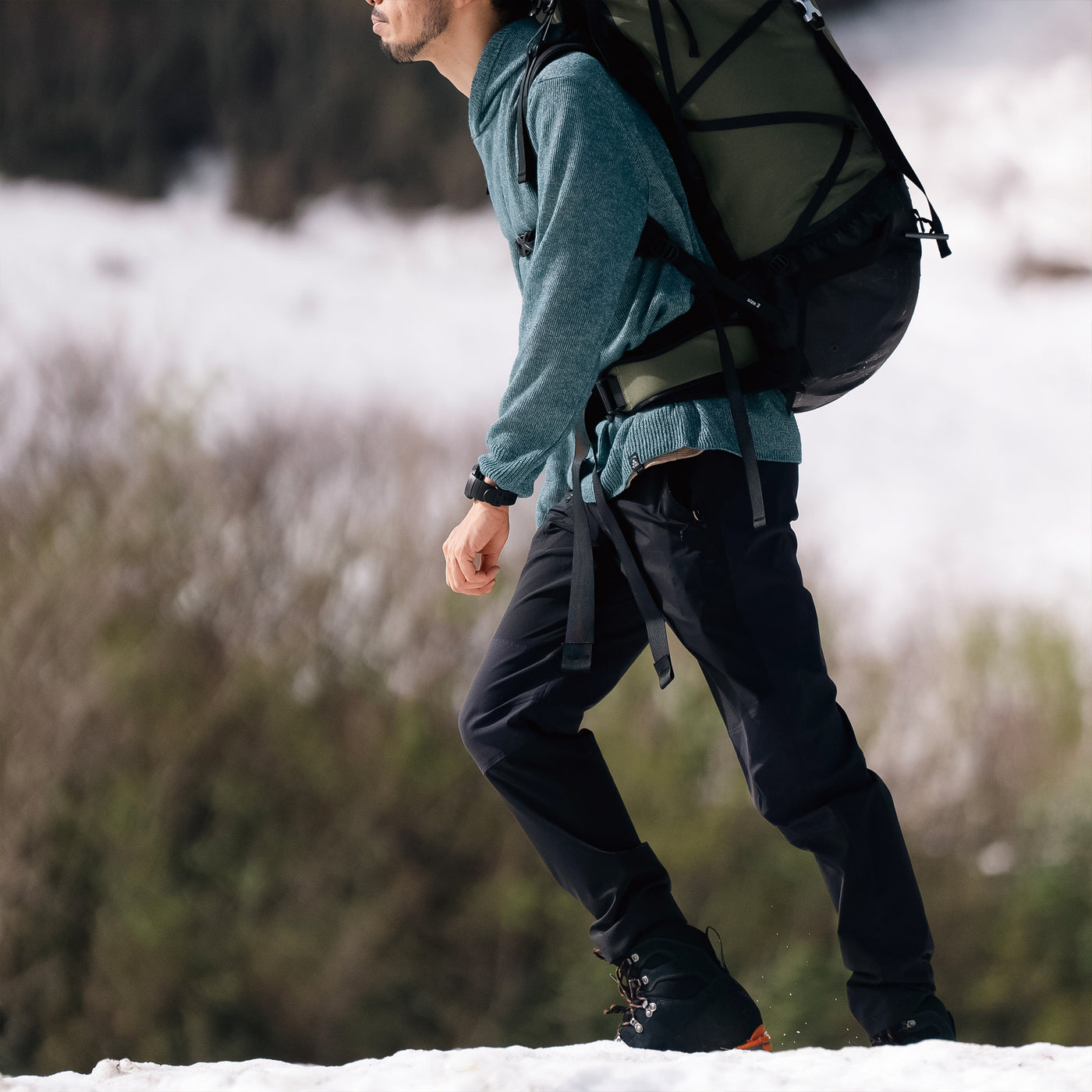 テクニカルなデザインですが、刺繍ロゴも含めて落ち着いた配色のため街でも悪目立ちしません。気軽なハイキングからアルパイン、雪上ラン、クライミングまで幅広く活躍する、冒険の邪魔をしない一本です。