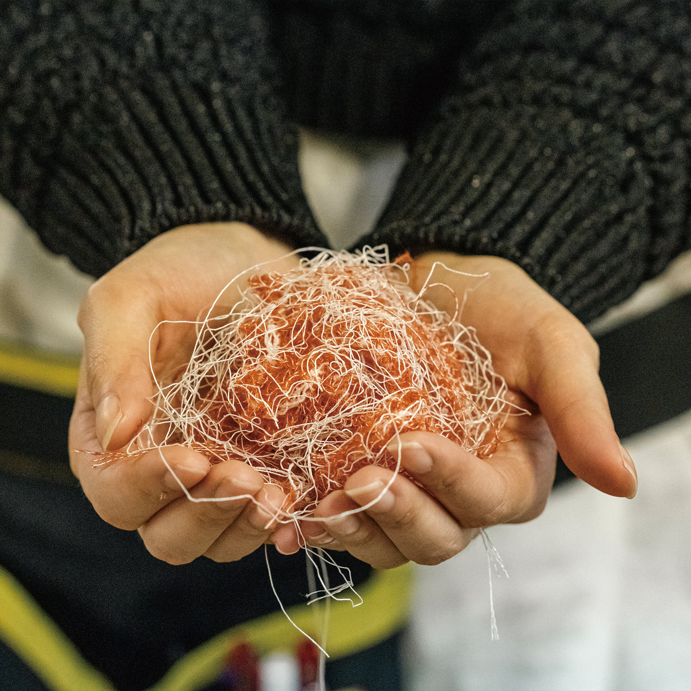 そして、この糸を使って丸ごと編みあげるホールガーメントによりニット製品を作りました。ホールガーメントでは糸からそのまま衣類を編んでいきます。通常Tシャツやフリースは生地裁断時に20〜30%ほどはロスとなり使えずに裁断ゴミになります(※)。しかしホールガーメントでは1着まるごと編み上げた場合、たった約6gの糸クズしか排出されない、ロス率で言うと5%以下のエコな製造方法なのです。